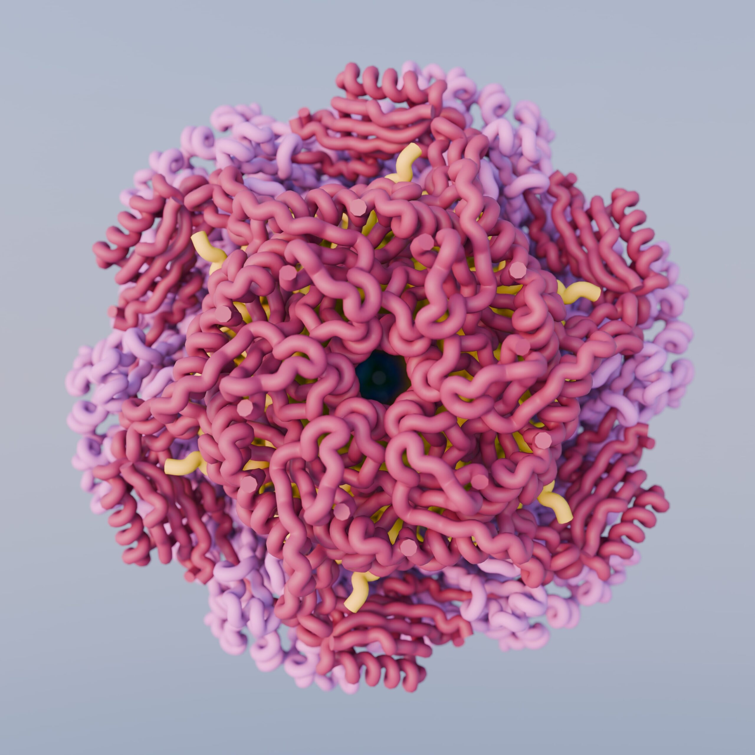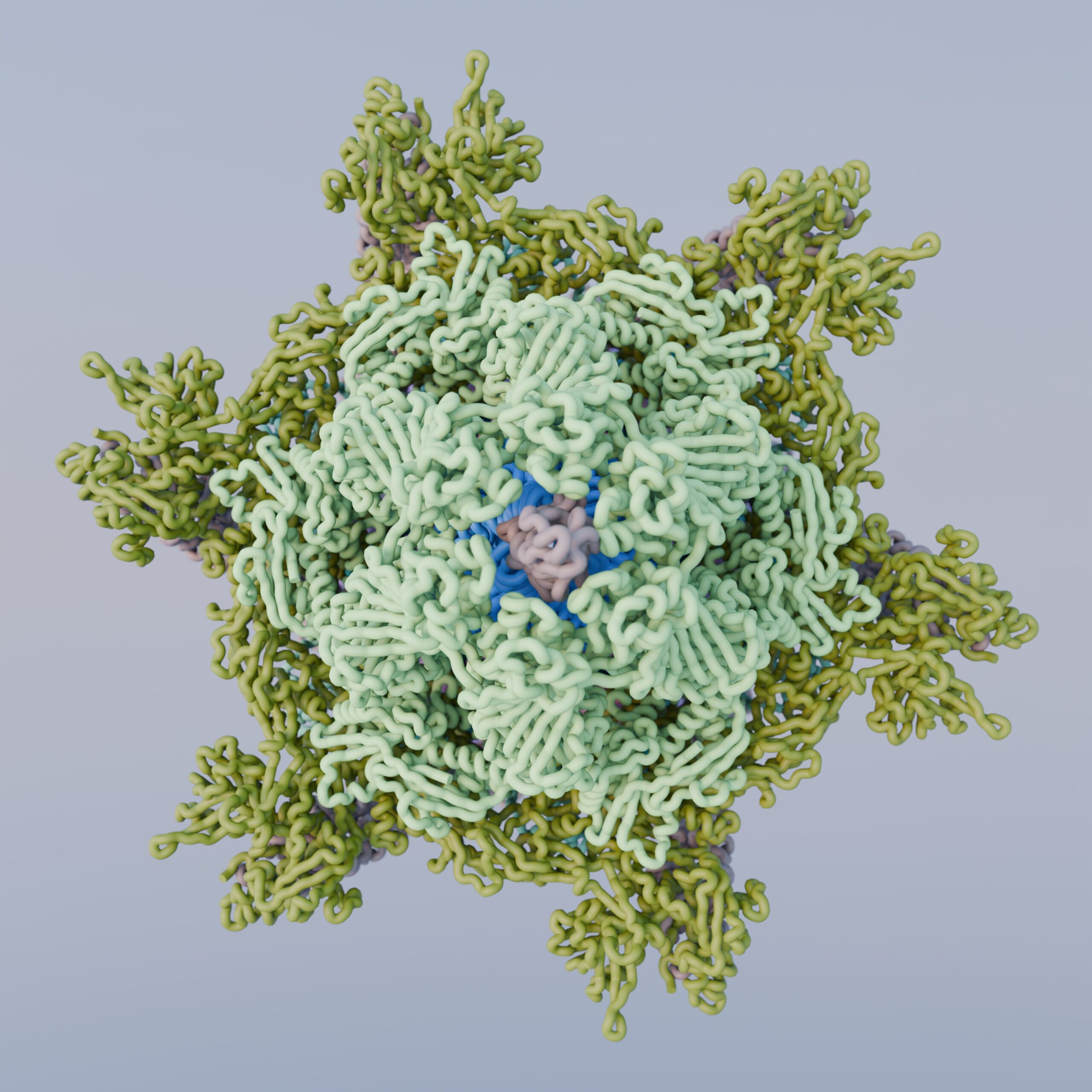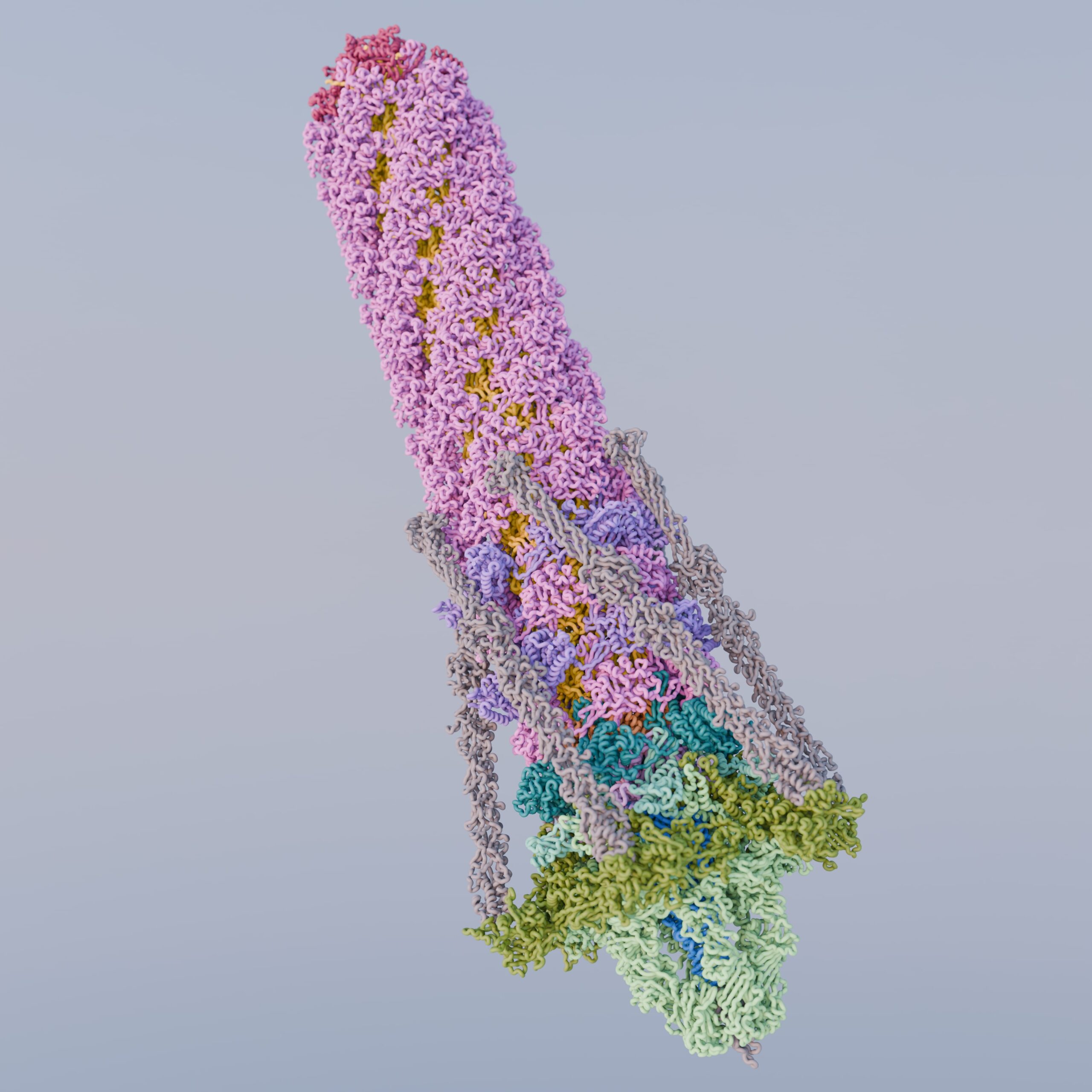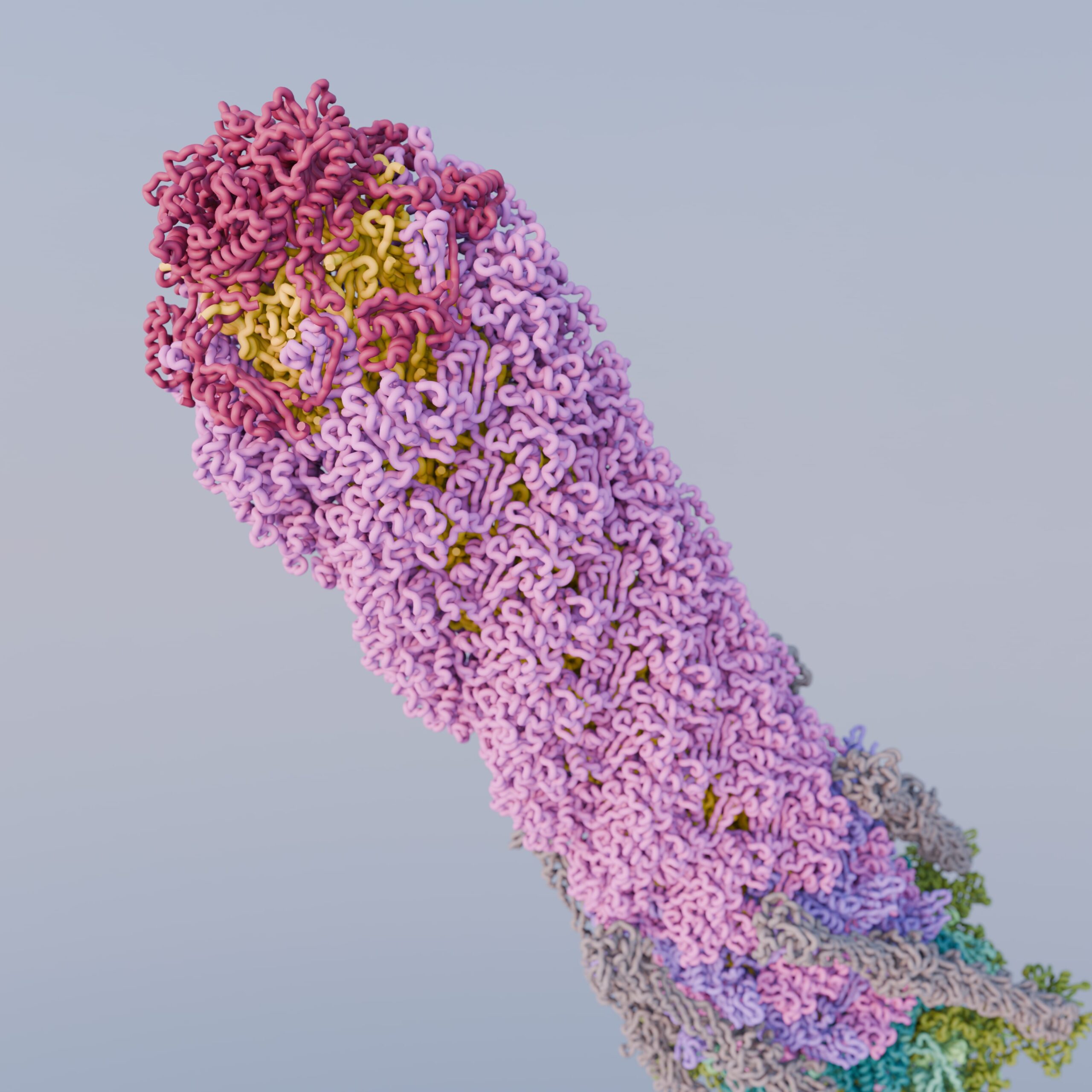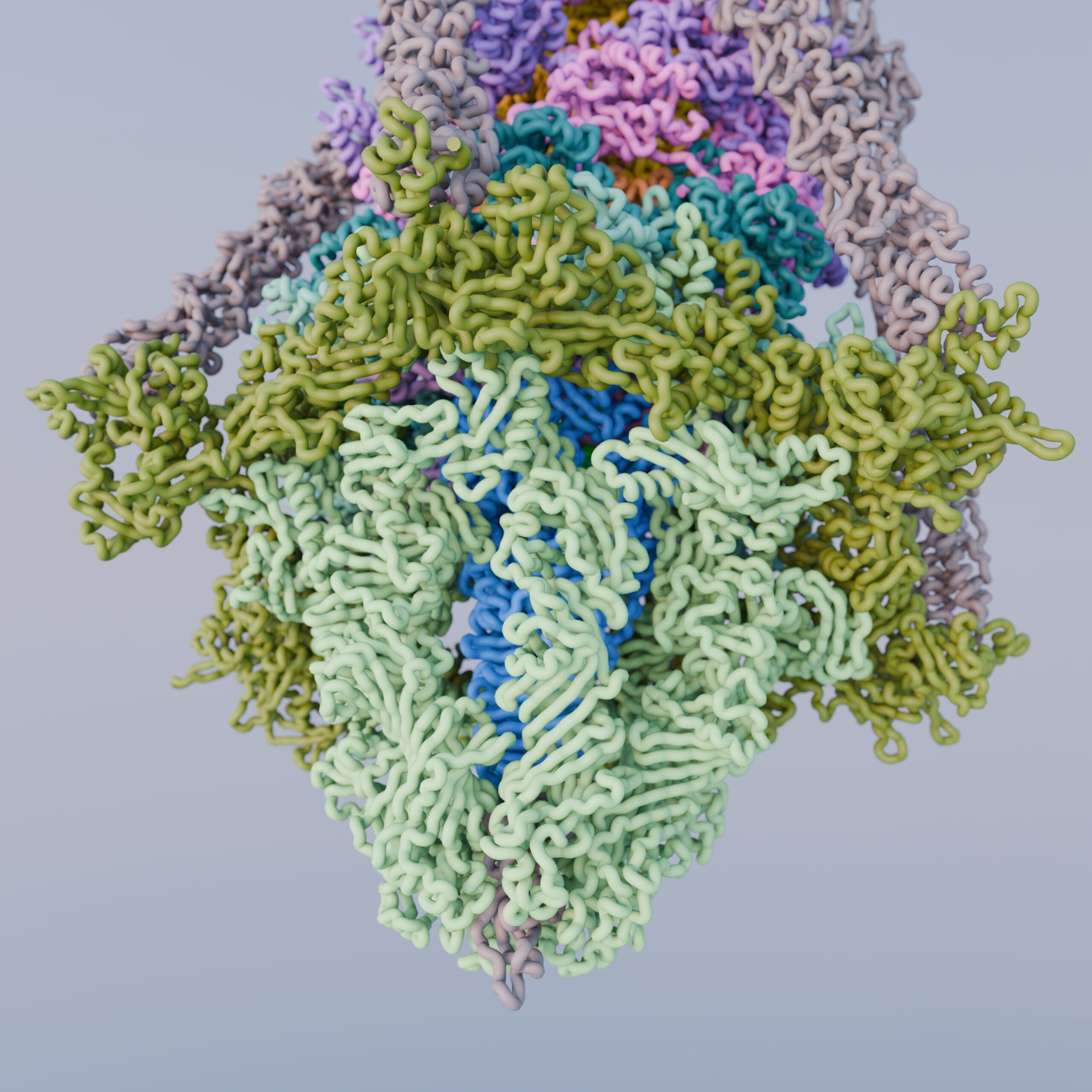Render of PDB ID: 5IV7, the structure of the post-attachment T4 baseplate. Highlighted in our work: Structure of the T4 baseplate and its function in triggering sheath contraction, Nature, 2016. Image created by Freddie Martin, using Blender and the Molecular Nodes package by Brady Johnston.
